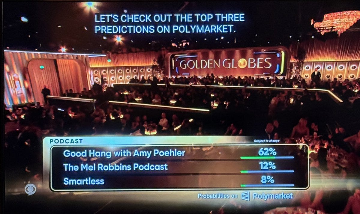 Just weeks ago at the 2026 Golden Globes, a small graphic appeared on the screen giving the odds of each nominee winning before each award was announced. By the end of the night, those odds, generated by thousands of people trading on Polymarket, had correctly predicted 26 out of 28 awards.