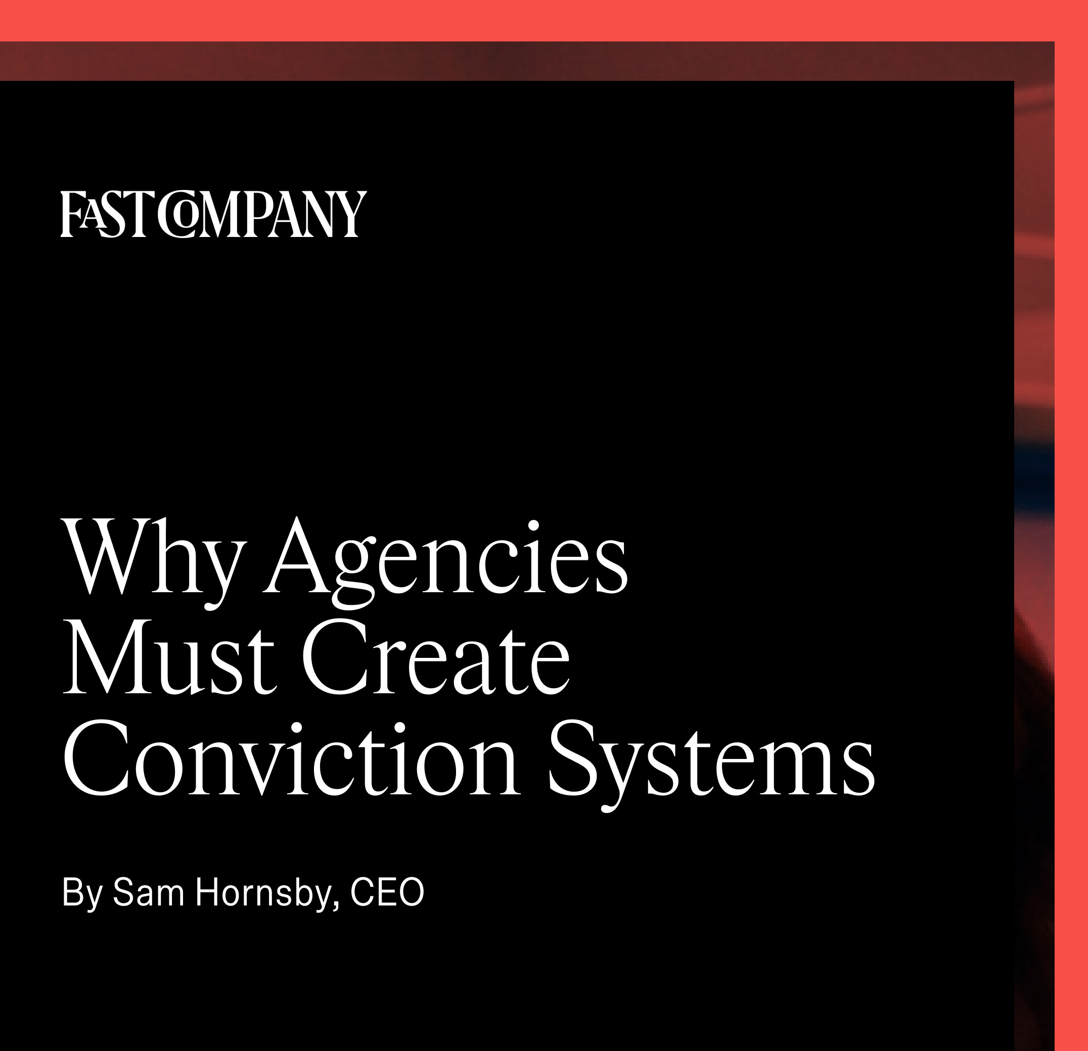 Read the latest article from Sam Hornsby, CEO & Founder, “Why agencies must create conviction systems” in Fast Company to dig deeper into our POV on creating successful agency-client partnerships.